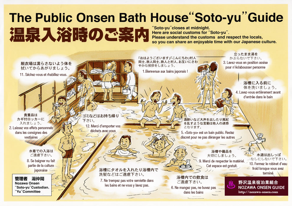 La petite serviette évoquée plus haut, outre le fait de vous permettre de vous sécher, pourra vous servir de cache-sexe si vous êtes pudique. Concernant ce point, n’ayez crainte, les japonais ont une autre relation à la nudité que celle en Occident. On ne vous dévisagera pas. Peut-être un regard se posera sur vous par curiosité car vous êtes étranger mais ce sera très rapide.