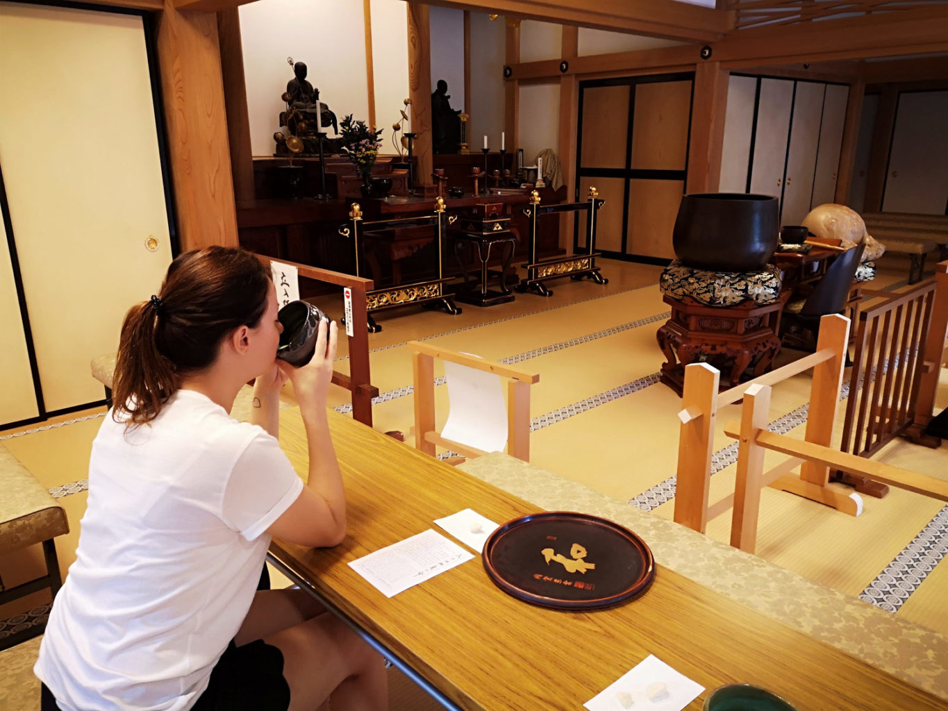 Malheureusement pressés par le temps, nous choisissons de limiter notre découverte du complexe afin de privilégier une pause dégustation d’un thé matcha accompagné d’un wagashi (和菓子, patisserie japonaise) dans le Engakuji Butsunichian. Pour ne rien gâcher, la pluie s’étant invité, nous avons la chance de pouvoir nous abriter à l’intérieur. C’est juste magnifique.
