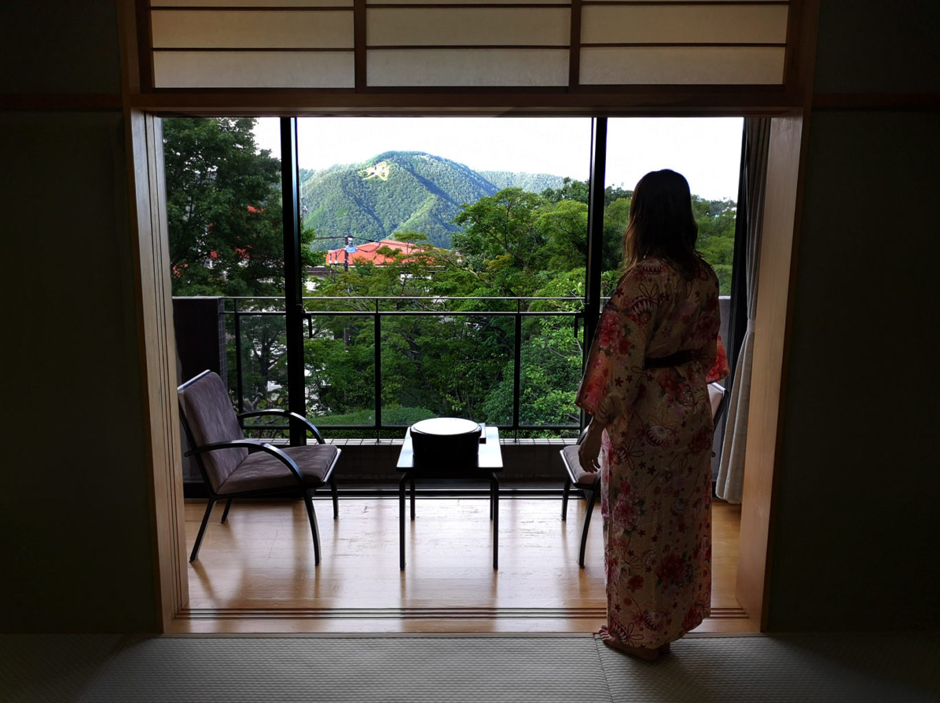 Lorsque nous arrivons au ryokan Gora Saryo, nous sommes accueillis par le propriétaire. Le cadre est somptueux. Nous nous voyons affublés d’un yukata et sommes invités à rejoindre notre chambre qui est dans le plus pur style traditionnel japonais. La vue sur la montagne ne gâche rien.