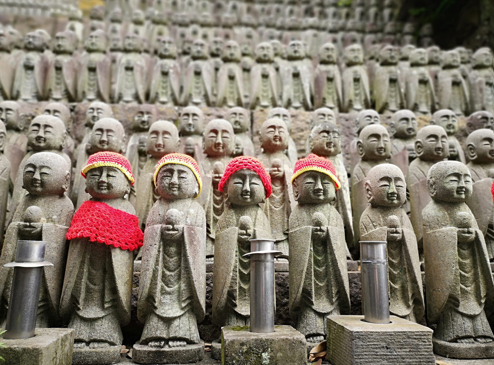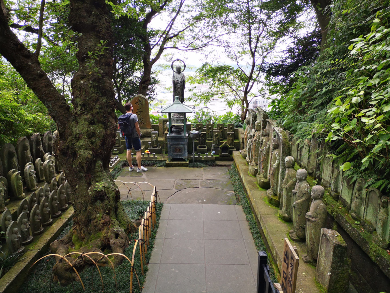 Ce temple est, lui aussi, superbe que cela soit son jardin japonais à l’entrée ou le panorama qu’il offre sur la baie. Nous y croisons une multitude de Jizo (le bodhisattva protecteur des enfants), statuettes représentants des nouveaux-nés disparus, figure que nous avions déjà croisée lors de notre visite du Zōjō-ji à Tokyo (on racontait ça ici).