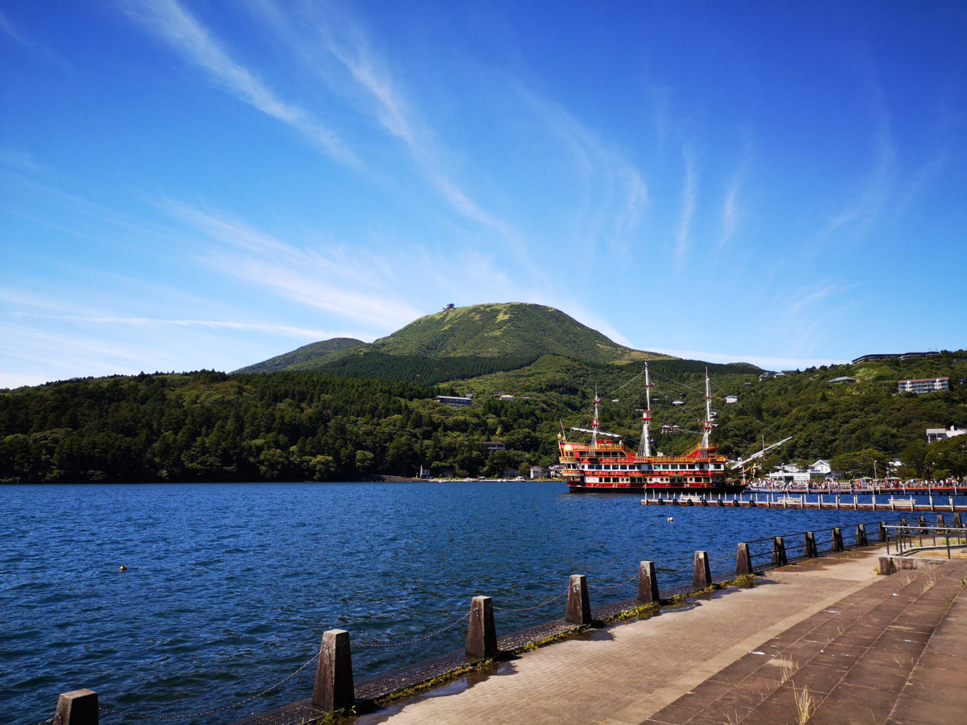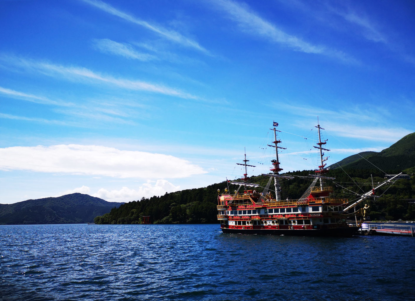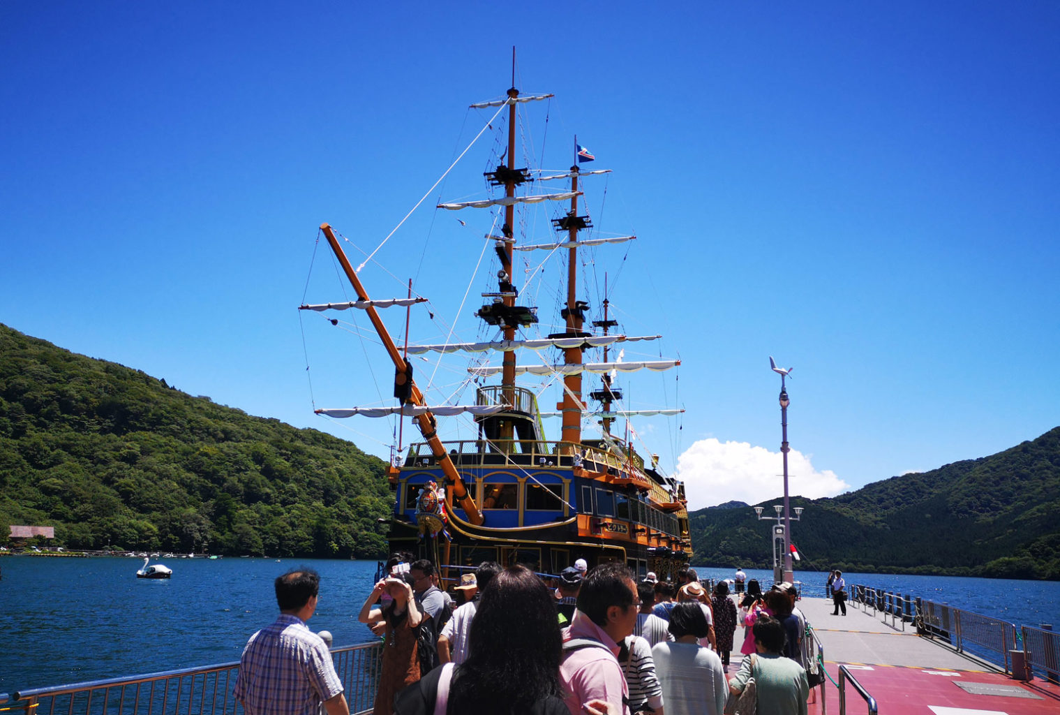 Le bateau arrive et nous découvrons un navire entièrement décoré afin de ressembler à un bateau pirate. C’est une des attractions bien connue d’Hakone. La traversée dure une trentaine de minutes et promet d’apercevoir le mont Fuji, chance que nous n’aurons pas. Une fois de plus, Fujisan joue à cache-cache avec nous !