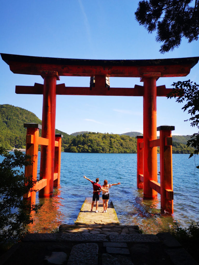 Nous arrivons au dernier point de notre parcours du jour : Hakone Jinja. Nous sommes surpris de tomber nez à nez avec une looooongue file de personnes au bas des marches menant vers le sanctuaire. Mais la foule ne patiente pas pour y accéder. Non. Elle patiente pour se prendre en photo sous le torii géant situé au bord du lac Ashi !