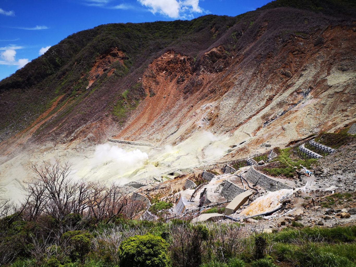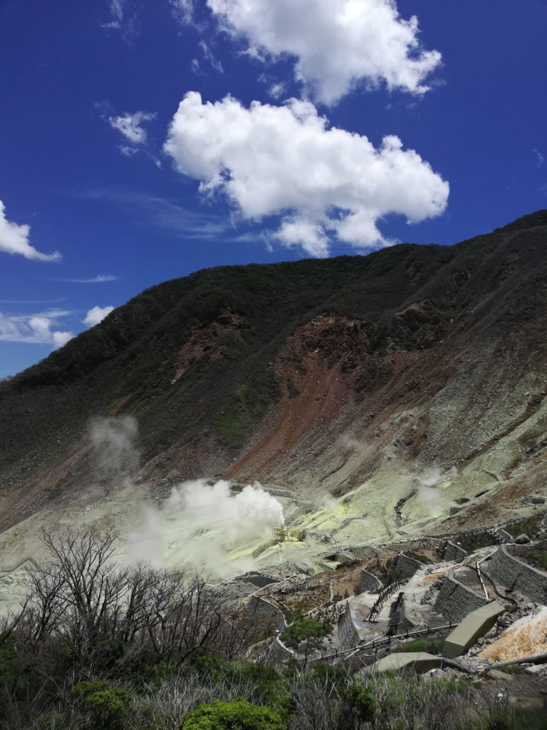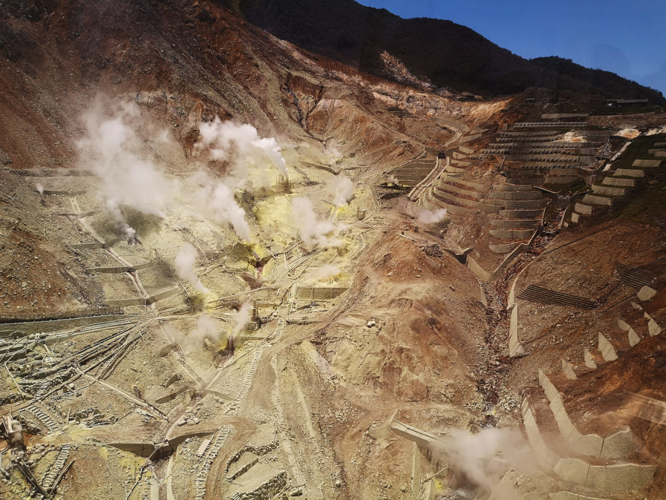 Nous arrivons sur le site d’Owakudani d’où l’on peut apercevoir les sources chaudes sulfureuses que nous ne pourrons malheureusement pas approcher.