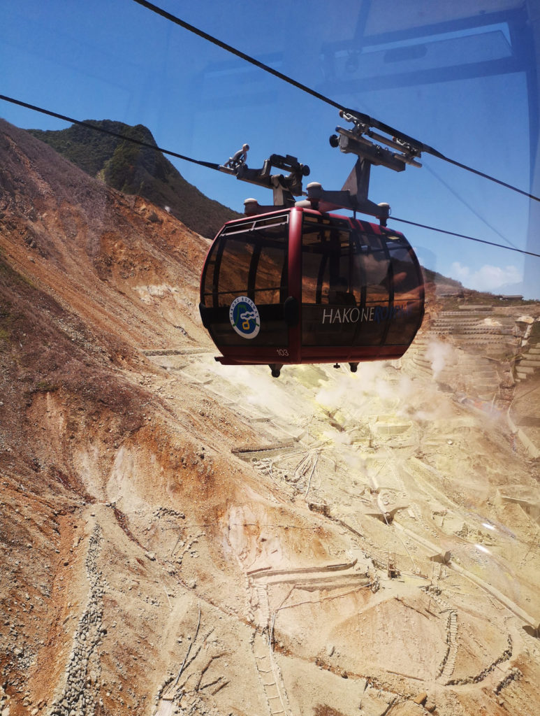 Le funiculaire nous permet de rejoindre la station du funitel qui nous emmène vers Owakudani, « la grande vallée bouillante ».