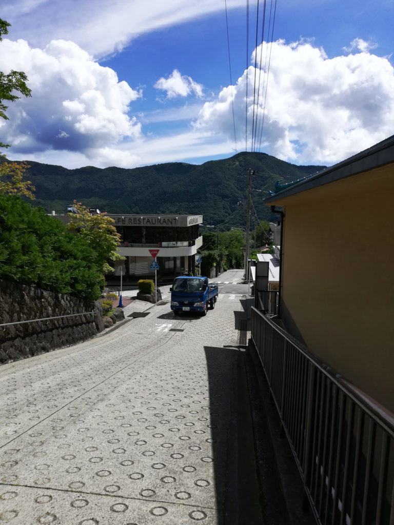 Il est 16h, nous quittons Hakone en bus depuis l’arrêt tout proche à Motohakone. Le véhicule est bondé, nous devrons donc rester debout la trentaine de minutes que dure le trajet jusqu’à la gare. Le conducteur prend son pied sur les routes sinueuses qui descendent jusque dans la vallée. On s’accroche !